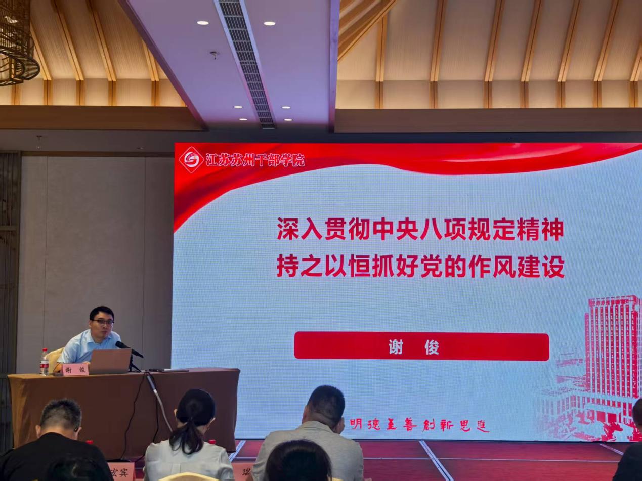 近日,“苏干院·故事荟”走进苏州市东吴教育培训学校。江苏苏州干部学院党的理论与党性教育教研室谢俊老师受邀为苏州市工会经审干部培训班作《深入贯彻中央八项规定精神 持之以恒抓好党的作风建设》专题讲座。