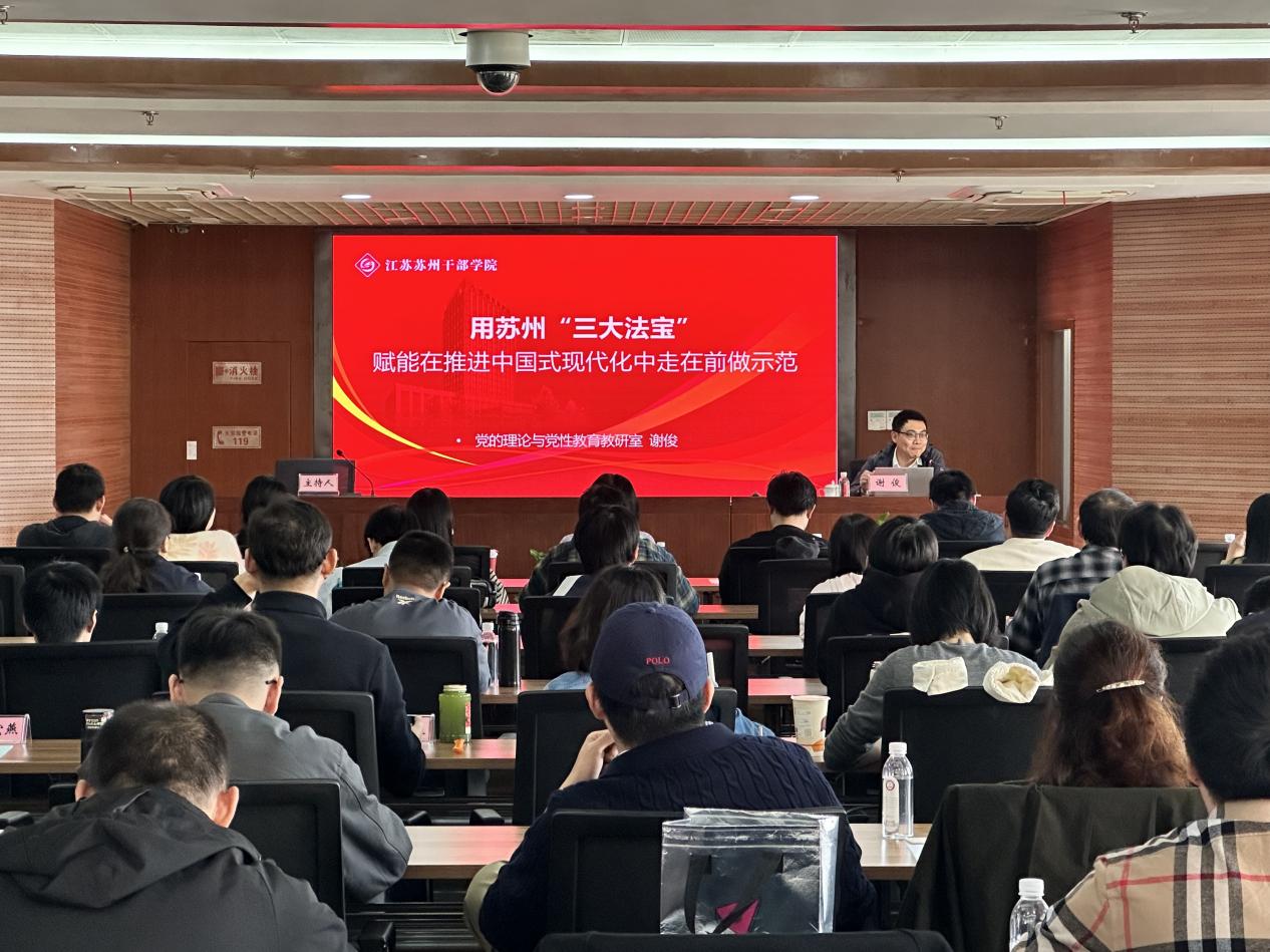 近日,“苏干院·故事荟”走进昆山市委党校。江苏苏州干部学院党的理论与党性教育教研室谢俊老师受邀为昆山市场监管专题培训班作《用苏州“三大法宝”赋能在推进中国式现代化中走在前做示范》专题讲座。