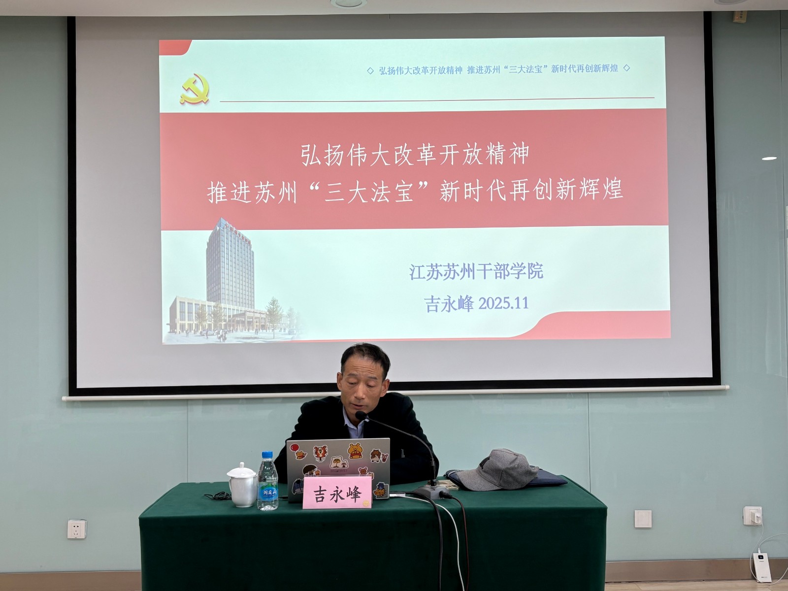 近日,“苏干院·故事荟”走进姑苏区城市基层党建学院。在“2025年盐城市交通运输局基层党组书记培训班”上,江苏苏州干部学院吉永峰老师以“弘扬伟大改革开放精神 推进苏州‘三大法宝’新时代再创新辉煌”为题,为培训班学员们带来了一场专题授课。吉永峰老师从“苏州‘三大法宝’的内涵和演变历程、苏州‘三大法宝’的精神实质以及弘扬伟大改革开放精神 推进中国式现代化苏州新实践的具体着力点”等三个方面展开阐述。